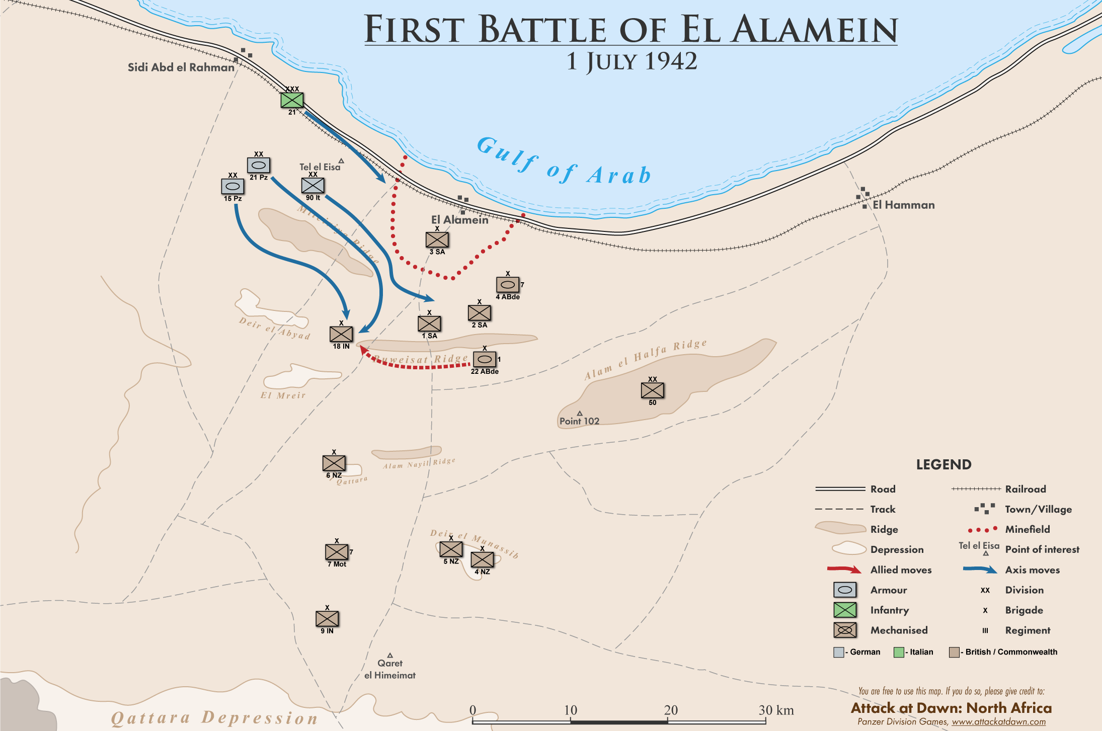 After defeat in battle of Gazala, Allied forces retreated westwards. At Marsa Matruh they have put up some restistance, but soon they continued their retreat towards El Alamein line. This line was meant to be a series of defensive boxes stretching between El Alamein and Qattara depression, but at the moment of their arrival the only finished segment was the El Alamein box.