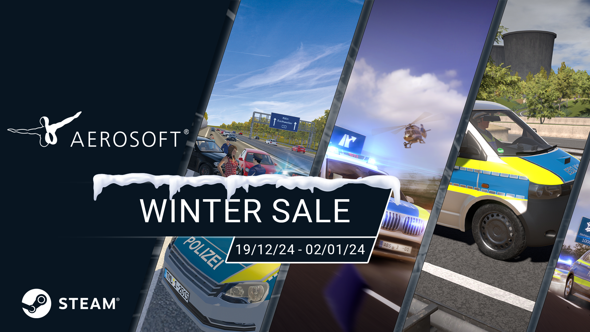 [p]Now is the perfect time to take action on Germanyโs and America's highways. Several titles from the Autobahn Police Simulator series and Highway Police Simulator are currently available at great discounts.[/p][p][/p][p][img src="https://clan.akamai.steamstatic.com/images/44533592/cc67265fd9a75585d5b81bc51cc47e280f2f729b.jpg"][TAG-10][/p][p]Autobahn Police Simulator is available with an 80% discount. Autobahn Police Simulator 2 follows with 60% off, while Autobahn Police Simulator 3 is reduced by 50%.[/p][p]The expansions for Autobahn Police Simulator 3 are also on sale: Off-Road comes with a 33% discount, while Police Motorcycle and Speed Trap are both available with 20% off.[/p][p]In addition, Highway Police Simulator is currently discounted by 40%.[/p][p][/p][p]๐จ Jump in, turn on the sirens, and start patrolling![/p][p][/p][p][dynamiclink href="https://store.steampowered.com/app/2789130/Highway_Police_Simulator/"][dynamiclink href="https://store.steampowered.com/app/348510/Autobahn_Police_Simulator"][dynamiclink href="https://store.steampowered.com/app/483770/Autobahn_Police_Simulator_2"][dynamiclink href="https://store.steampowered.com/app/1065520/Autobahn_Polizei_Simulator_3"][TAG-60][dynamiclink href="https://store.steampowered.com/app/3679160/Autobahn_Police_Simulator_3__Police_Motorcycle/"][dynamiclink href="https://store.steampowered.com/app/3679150/Autobahn_Police_Simulator_3__Speed_Trap/"][/p][p]Whether youโre treating yourself or expanding your game library, this immersive simulator is sure to deliver hours of fun! ๐๐[/p][p][/p][p]๐ Check out the Steam Store News for more details and additional offers.[/p][p]https://links.aerosoft.com/WinterSale25[/p][p][/p]