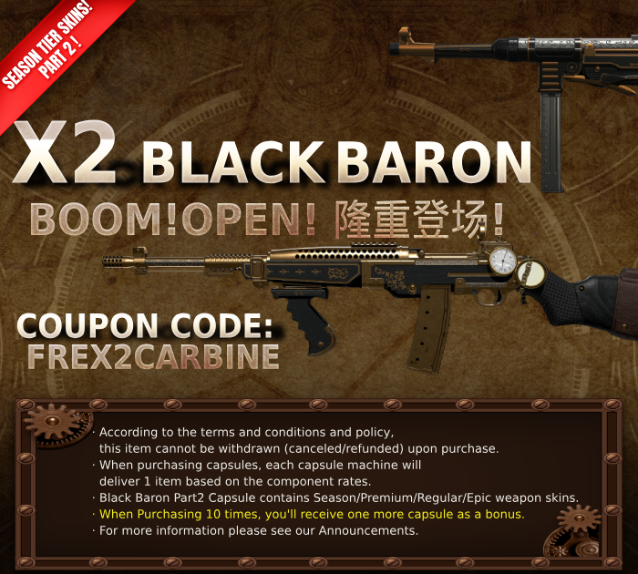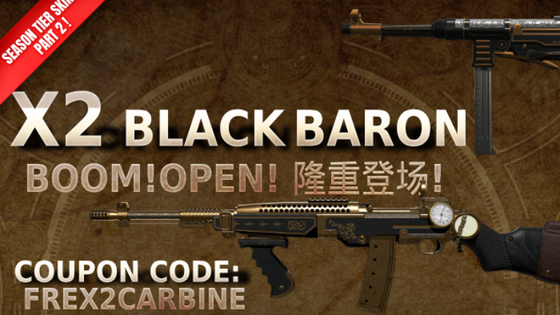 Plus, if you collect 4 of all Black Baron skins include X1897 Black Baron, MAN-G4 Black Baron, V Nagant Black Baron, X2 Black Baron, XP40 Black Baron, you'll receive Unique Soldier Box *2 after the event schedule. You can only receive the reward once.