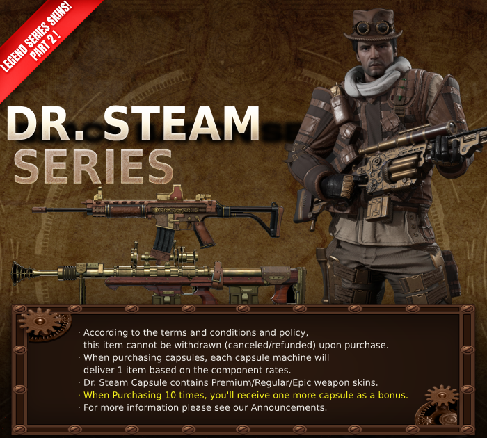 We're also excited to announce the Dr. Steam Final Collection Skin Event! If you collect [Dr.Priest Steam], [KCR Dr. Steam] and, [DXR-1 Dr. Steam] Dr. Steam series skins we've introduced, you'll receive [Auto 9 Dr. Steam] skin. Don't miss out on this limited-time opportunity.