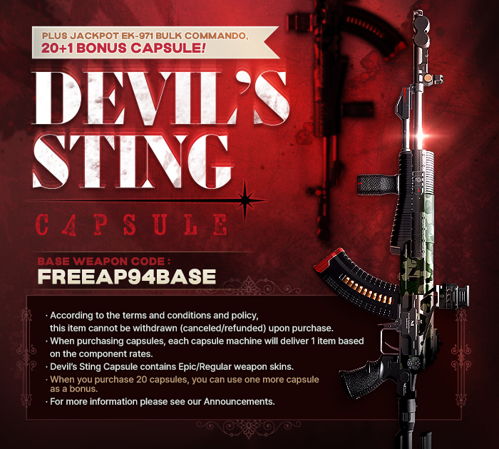 Please note that: The Devil's Sting Capsule contains Premium, Epic, and Regular tier weapon skins which can be used in Skin Combination System. When you purchase 20 capsules, you will obtain one more capsule as a bonus.