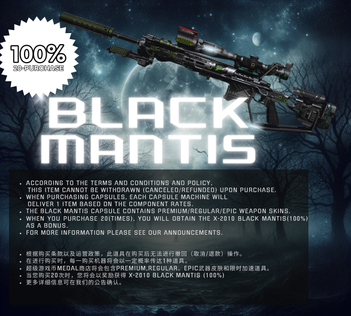 [Open Schedule] Time (UTC): February 20th, 2024, 06:00 AM ~ February 26th, 2024, 00:00 AM Note: The X-2010 Black Mantis is also obtainable after 20 capsule purchases as a bonus. *Please note that the open schedule may be subject to change.