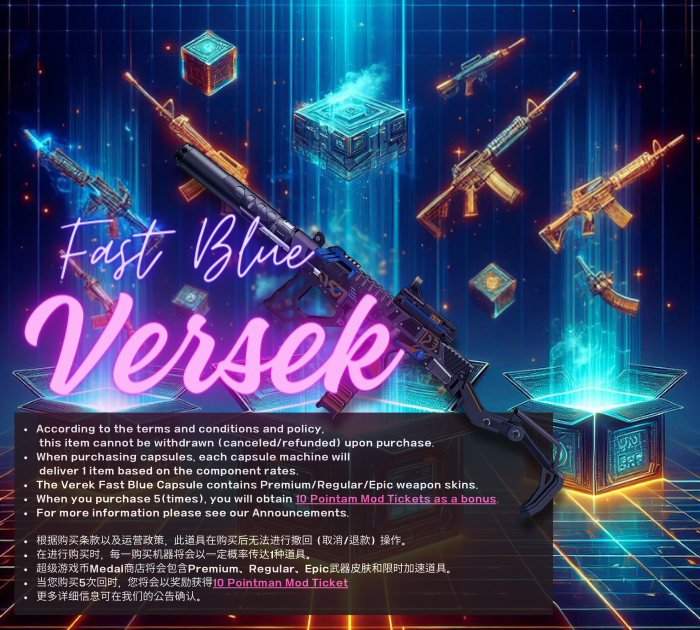 [Open Schedule] *Time (UTC): 2024. 1. 12, 06: 00 AM ~2024. 1. 17, 00: 00 AM Please note that the Verserk Fast Blue contains Premium/Regular/Epic weapon skins. When you purchase 5(times), you will obtain 10 Pointman Mod Tickets as a bonus.