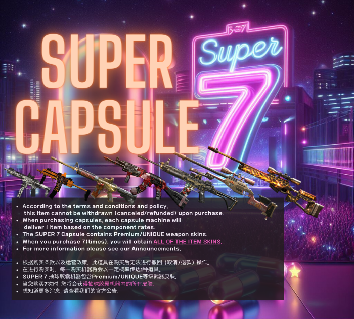 In this capsule, you will have a 100% chance to obtain all Unique/Premium weapon skins. When you Purchase each capsule, you will have a 1/7 chance to obtain one of the weapon skins: X-plorer Blaster, Cursed MA-47 Void Man, KCR Black Mist, G93 May Queen, Silver Arrow Golden Soil, Invader SPIRIT, Bahamut Levia