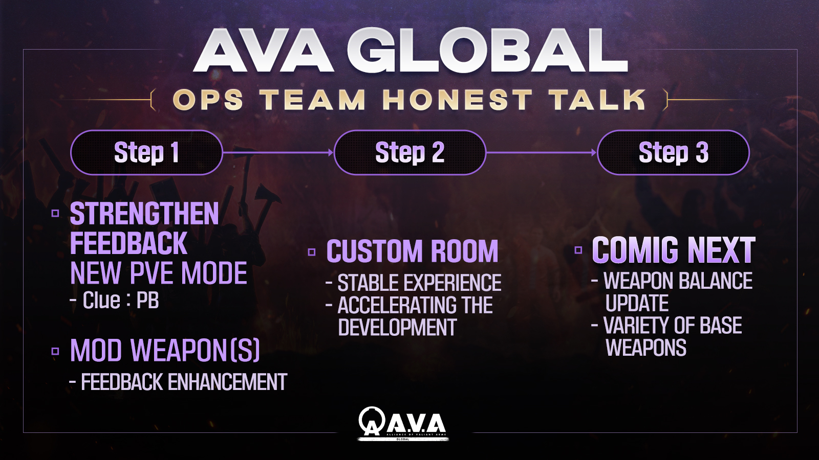 - New PVE mode: Since the launch of AVA Global, users have been requesting the release of various PVE modes. In response to this feedback, we have introduced a variety of modes such as AVA Train, Death Valley, and Overrider. While many users have enjoyed these modes, we have received numerous requests for improvements to these mode updates. We are currently working on preparations to introduce a new PVE mode as quickly as possible, and we hope to share the news of the mode update with you through the January update. (Hint: P.B.)