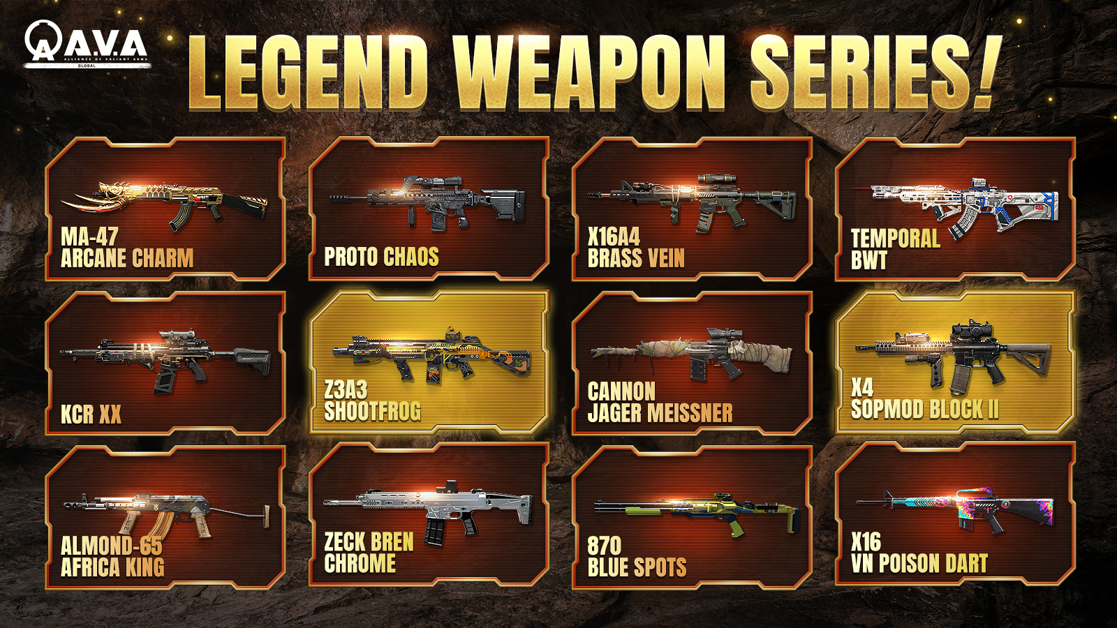 Please note that: The Legend Series Capsule features a collection of MA-47 Arcane Charm, Proto Chaos, X16A4 Brass Vein, Temporal BWT, KCR XX, Z3A3 Shootfrog, Cannon Jager Meissner, Almond-65 Africa King, Zeck Bren Chrome, 870 Blue Spots, X16 VN Poison Dart, X4 SOPMOD Black II weapon skins. The Legend Series Capsule contains Unique, Premium, Regular tier weapon skins, and Euros.