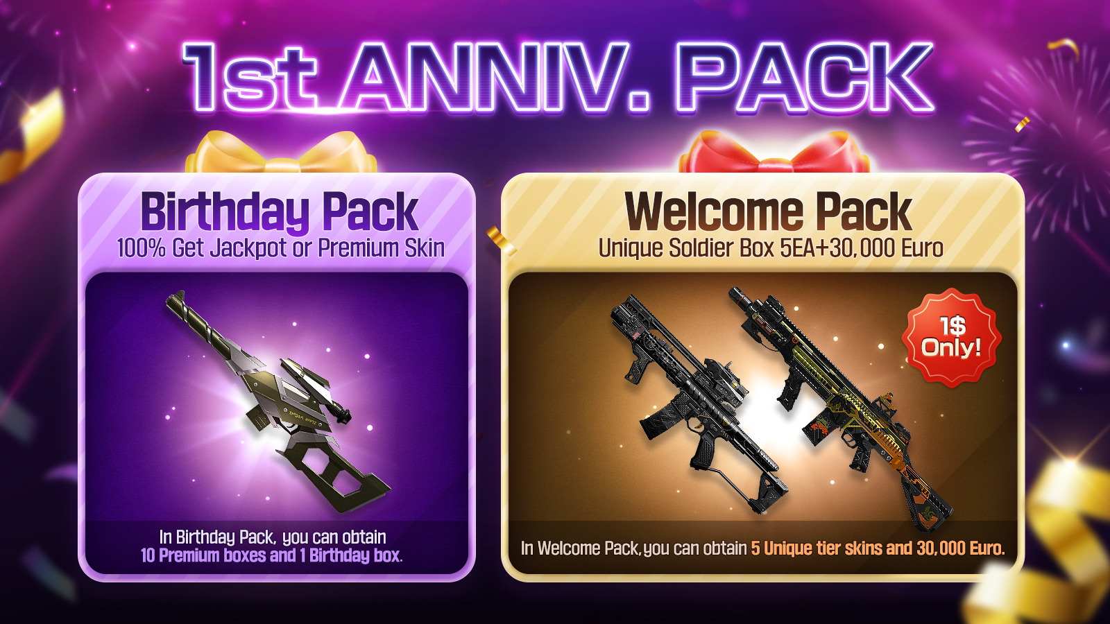 *You can purchase [Birthday Pack] & [Welcome Pack] skins in the in-game shop. Where you can obtain it? = In-game shop >> Featured >> Package *Please note that the Welcome Pack can be purchased only once.
