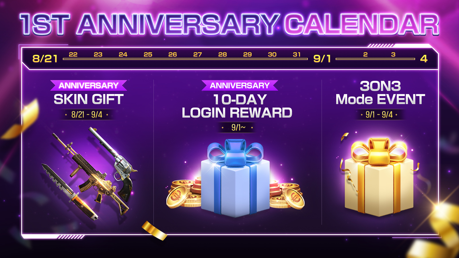 For the 1st Anniversary event, we've introduced exclusive Anniversary skins including Primary weapon, Secondary weapon, and Throwable weapon. And today, our last Anniversary Melee skin will be distributed.