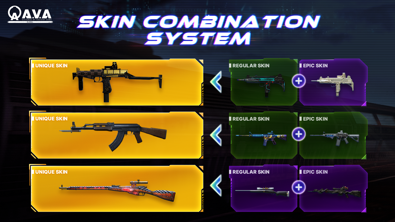 "Skin Combination" is a mechanic of consuming two weapon skins to obtain a new weapon skin.