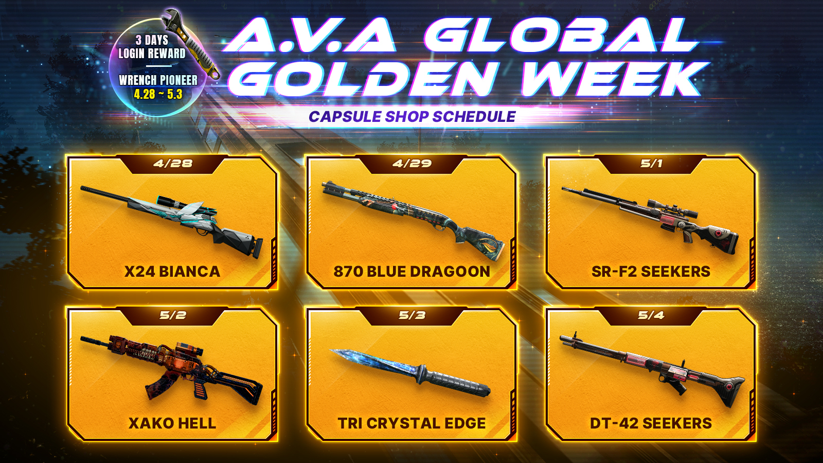 But wait, there's more! Don't miss out on the reopening of the Capsule shop items that will be available soon. For the full schedule of the A.V.A Global Golden Week, please check below.