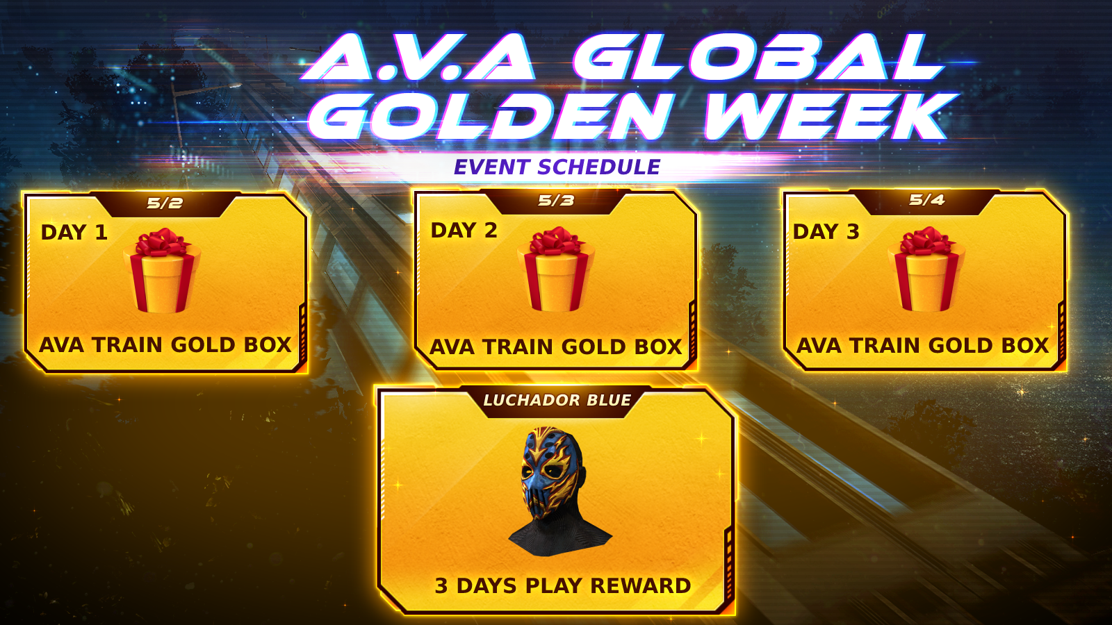 1. From May 2nd to May 4th, 2023, play AVA Global and earn an AVA Train Gold Box for each day you play.