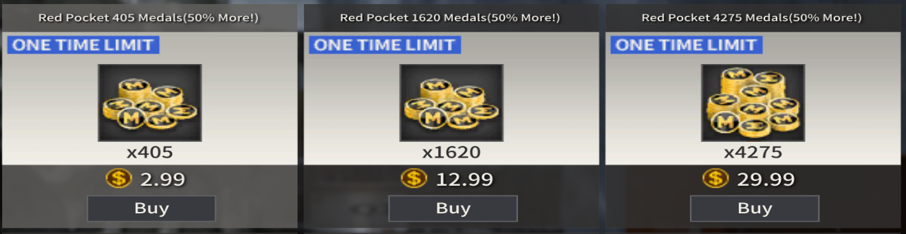 *Red Pocket Medal Pack Open with steam money. 1.Items acquired abnormally will be withdrawed without notice and sanctions may proceed. 2.Components and sales methods may change due to internal circumstances.