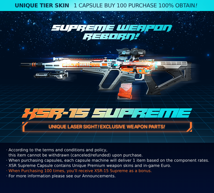 Please note that: The Rampage Capsule features a collection of XSR-15 Supreme, MCX SBR Maxtech, Hecate Inspire, SD5 Sulfur Weapons contains Unique/Premium weapon skins and in-game items. When purchasing 100 times, you'll receive XSR-15 Supreme as a bonus!