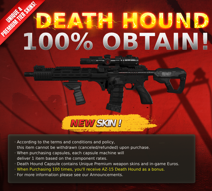 Please note that: The Rampage Capsule features a collection of AZ-15 Death Hound, VZ-19 Death Tiger, X16A2 Black Rain, Hawk416C Diabolic Weapons contains Unique/Premium tier weapon skins and in-game Euros. When purchasing 100 times, you'll receive AZ-15 Death Hound as a bonus!