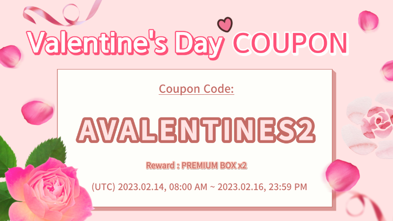 [The coupon can be redeemed during this schedule] *Time (UTC): 2023. 02. 14 08:00 am ~ 2023. 02. 16, 23:59 pm *Europe Central Time (CET): 2023. 02. 14 09:00 am ~ 2023. 02. 17, 01:59 am *Beijing Time (BJT): 2023. 02. 14 16:00 pm ~ 2023. 02. 17, 08:59 am *Pacific Time (PT): 2023. 02. 14, 00:00 am ~ 2023. 02. 16, 15:59 pm