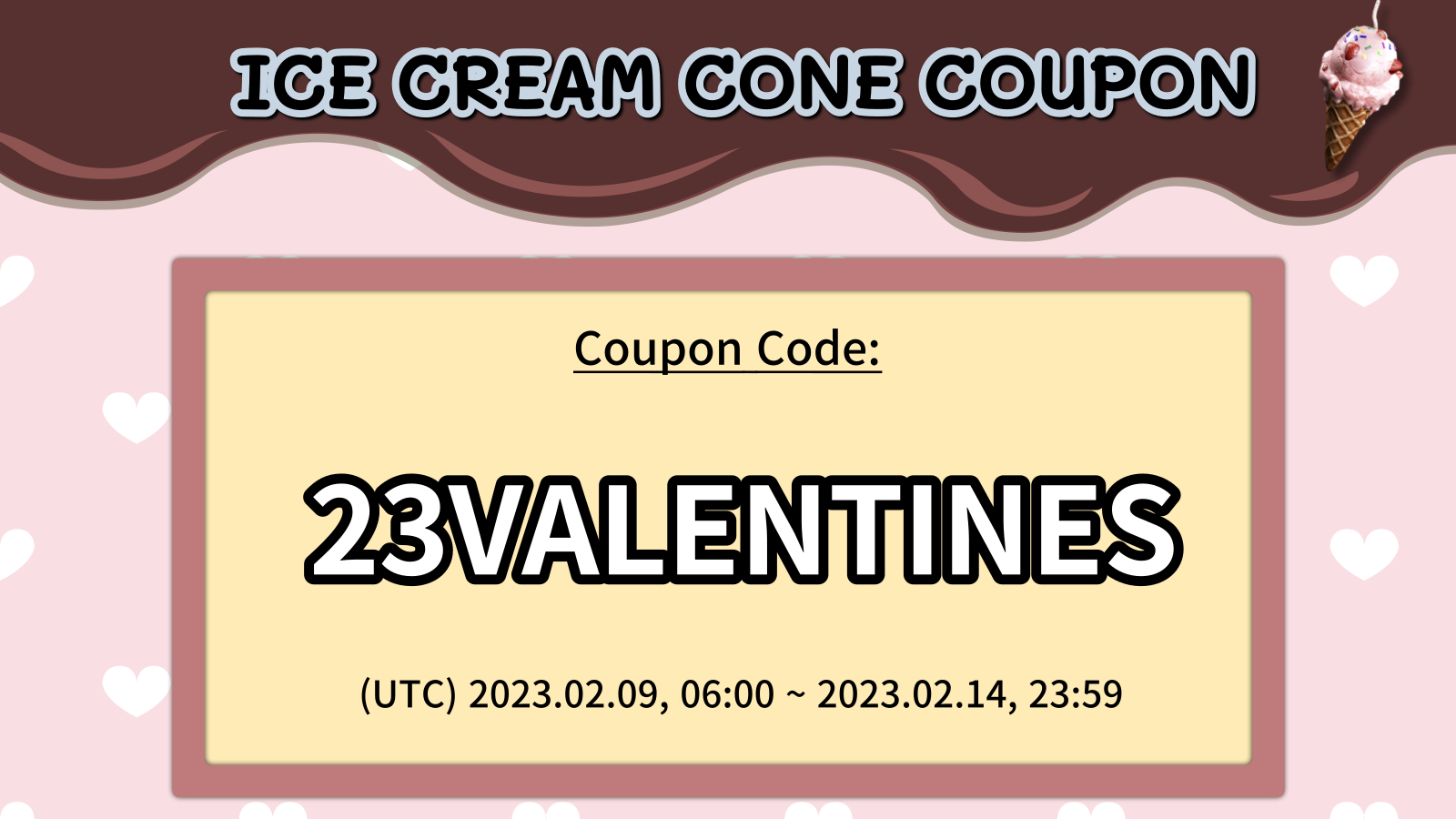 [Coupon Schedules] Ice Cream Cone Coupon : (UTC) 2023.02.09 ~ 2023.02.14 Valentine's Day Coupon : (UTC) 2023.02.14 ~ 2023.02.16 *Coupon schedules may be subject to change