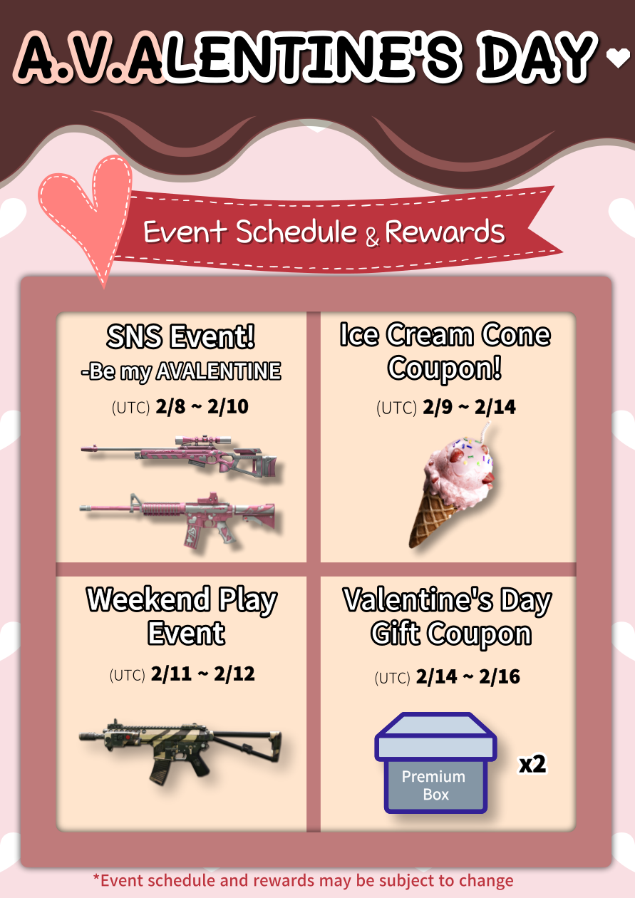 If you obtain both the Valentine's Day Weapon Skin & Character Skin, we will give you Premium Box * 10 to thank you for supporting A.V.A Global and making the battlefields sweeter during the A.V.Alentine's week!