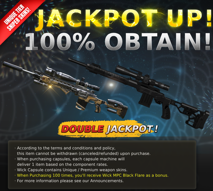 Please note that: The Wick Capsule features a collection of Sniper Weapon contains Unique/Premium tier weapon skins and in-game Euros. When purchasing 100 times, you'll receive Wick MPC Black Flare as a bonus!