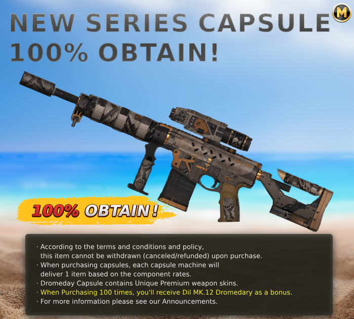 Please note that: The Dromedary Capsule features a collection of Dromedary Series contains Unique/Premium tier weapon skins and in-game Euros. When purchasing 100 times, you'll receive Dil MK.12 Dromedary as a bonus!