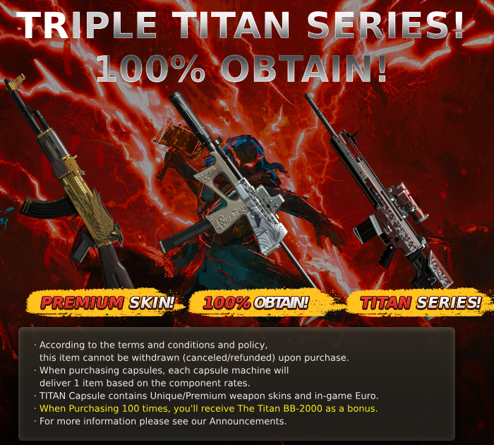 Please note that: The Titan 2000 Capsule features a collection of Season Series contains The Titan MA-47, The Titan Proto, The Titan BB-2000, VP18 Titan and in-game Euros. When purchasing 100 times, you'll receive The Titan BB-2000 as a bonus!
