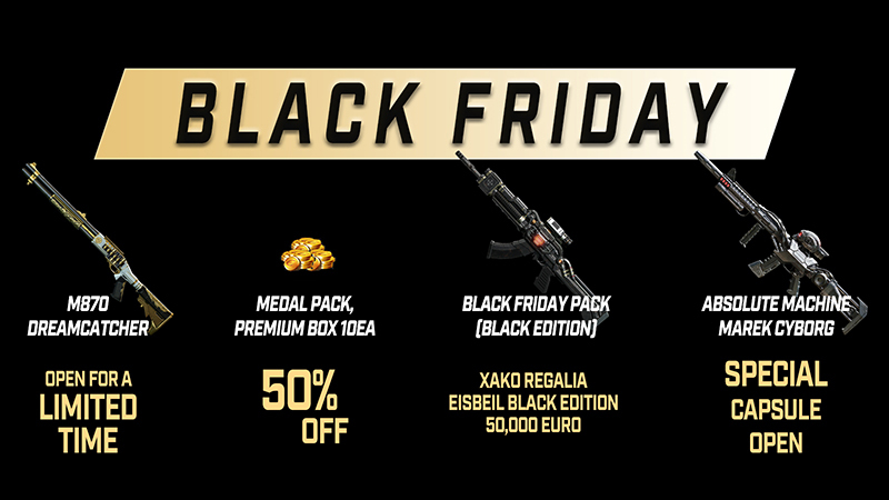 The Black Friday series is a specially-made skin based on the Xako XK. 95 and Ice Pick. You can get Xako Regalia, Eisbeil Black Edition, and 50,000 Euro from Black Friday Pack.