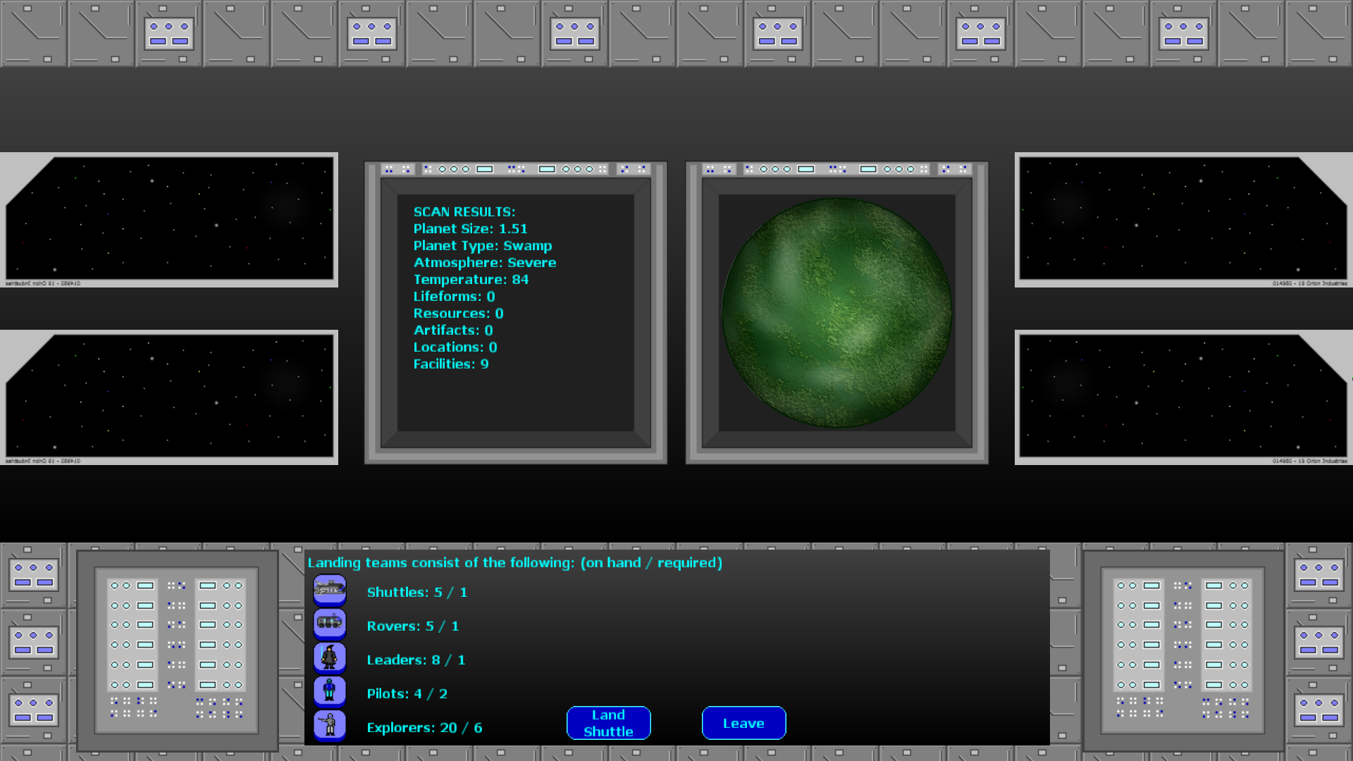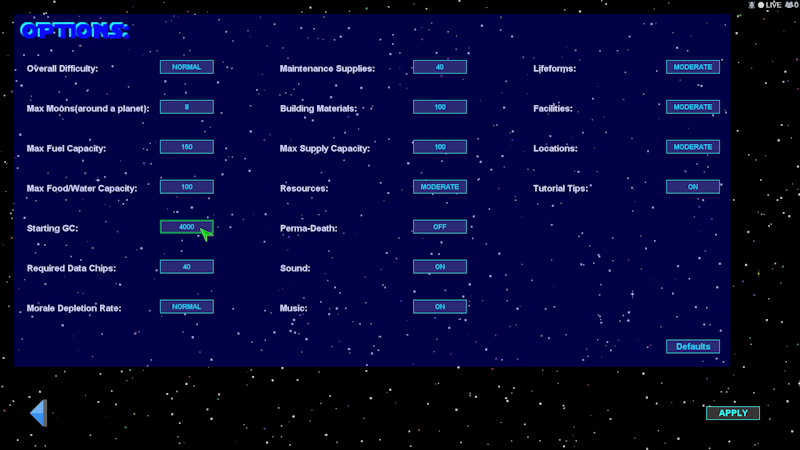 - Added two new options for morale depletion, very slow and very fast - Added option to use mouse for aiming ship turrets - Added three new items to Ship Upgrades DLC...luxury rooms, luxury suites, and asteroid laser - GUI graphic changes with buttons and icons that better explain ship controls at a glance - Slightly better chance at finding data chips in certain areas - Fixed bug which causes certain structures to not be built on moons - Fixed issue which caused a few items to not be in ship inventory after finding or purchasing - Fixed issue where landing on a planet would not allow explorers to disembark - Some performance improvements