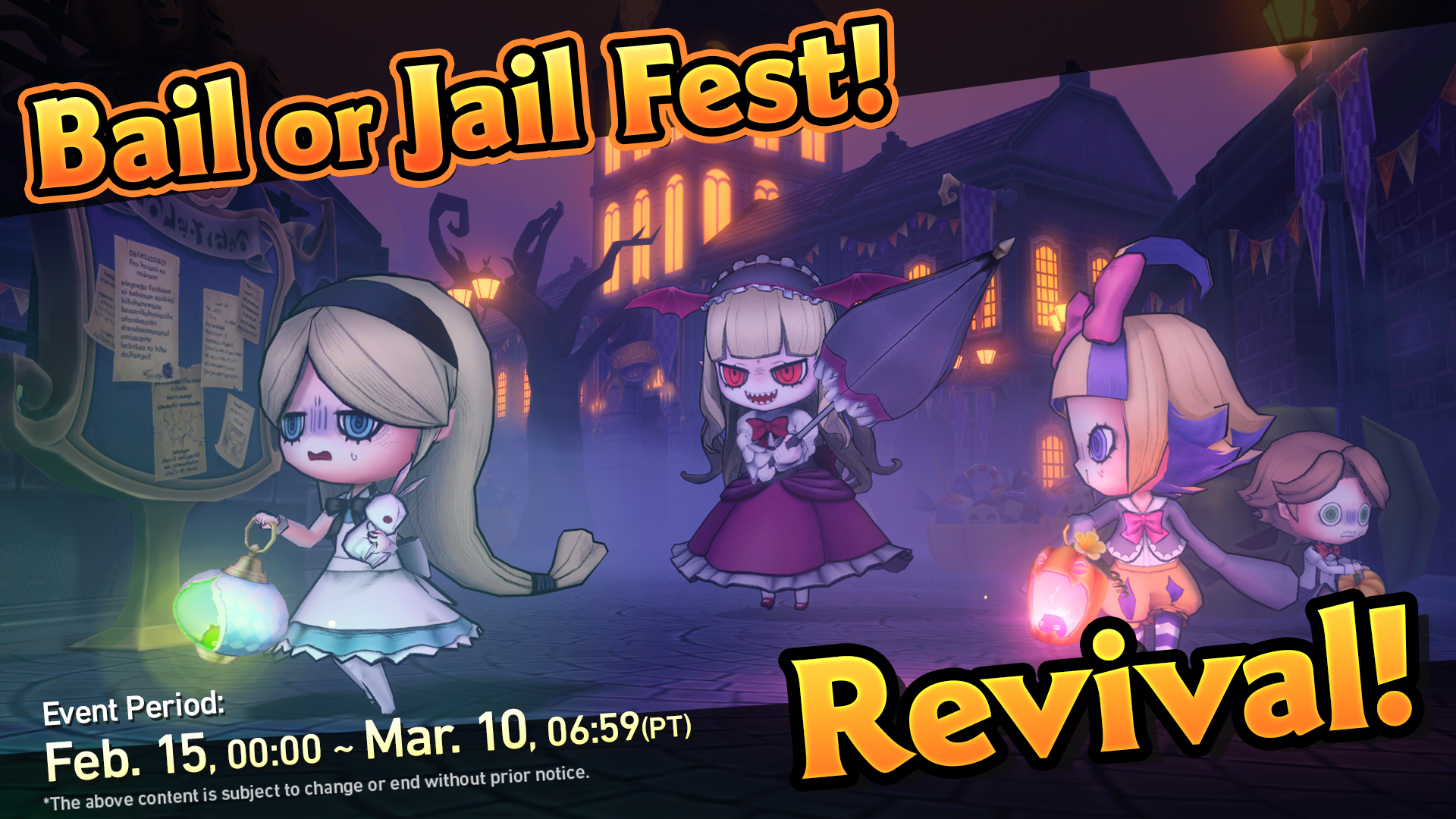 【Event Period】 Thu. Feb. 15, 2024, at 0:00 - Sun. Mar. 10, 2024, at 6:59 (PT) Enjoy Bail or Jail on the fest-limited maps!