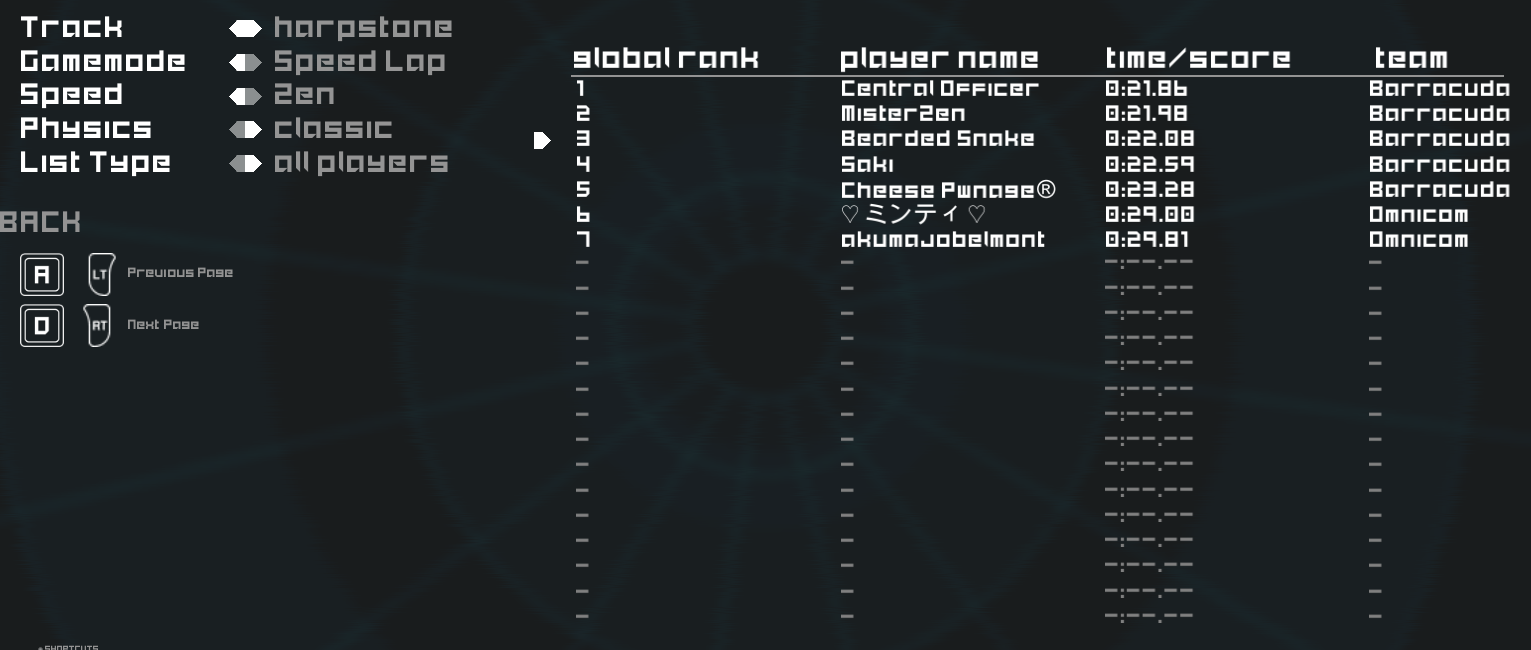 The game now has a new leaderboard system! The menu leaderboard now has a much better interface and the ingame leaderboard is now a panel that slides out from the side to show you the leaderboard for the current event that you're playing. The default binding for this is Tab on the keyboard and L3 for controllers.