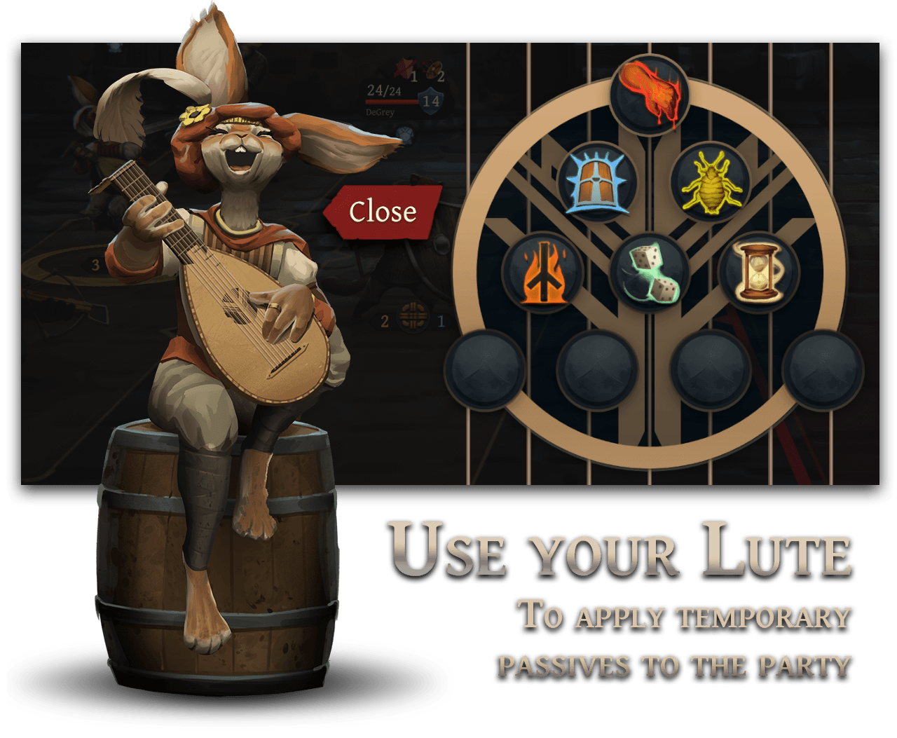 In combination with her Lute, Moonstone's unique hero ability allows her to apply temporary passives to all of her allies! New passives are made available every time Moonstone uses her ability. Those passives can then be applied by playing her Lute, and last until the next time Lute is drawn.