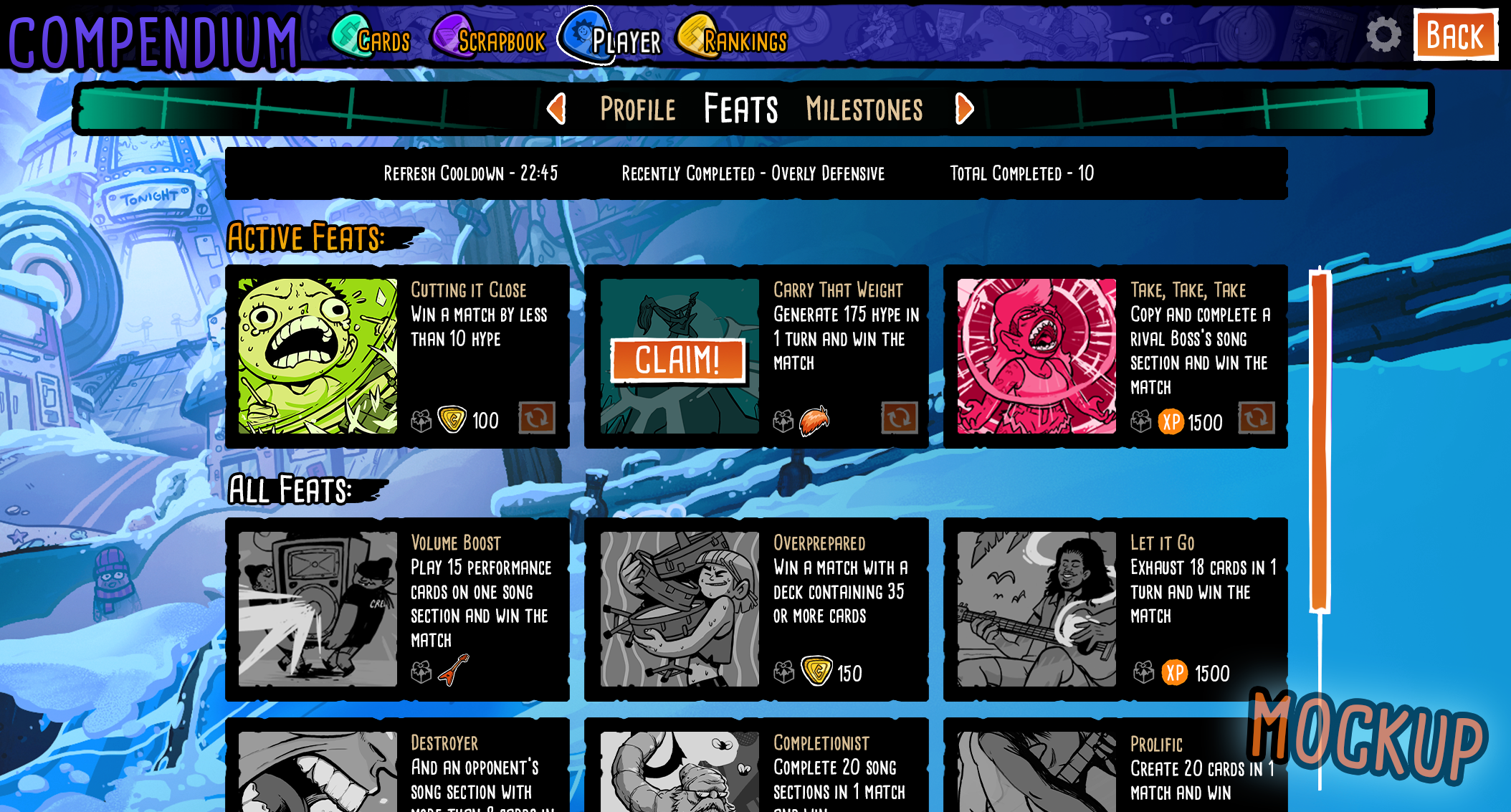 Feats are special challenges you can complete to earn extra credits, Backstage Pass XP, and even cosmetics. You have 3 active Feats at a time, pulled randomly from a large pool, and can refresh one of them every 24 hours. Completing and claiming the reward for a Feat will also refresh it. Feats will provide some extra challenge for players and get them to try new strategies in Tour and Royale!