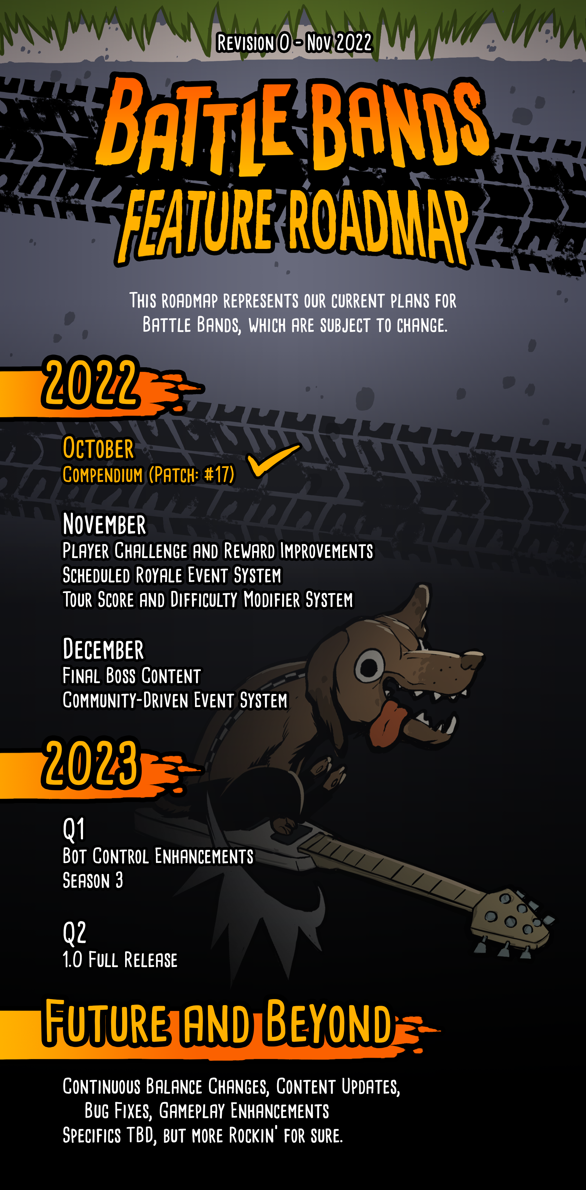 ALRIGHT, we've been getting lots of call-ins from you guys about this one- It's the Battle Bands Feature Roadmap! Now keep in mind that this is a living, BREATHING, ROCKING Roadmap, which means it's going to change as we add to it and possibly swap things around! Also, we'll be broadcasting plenty more specifics on EVERYTHING on this list in the coming months, so DON'T TOUCH THAT DIAL! (I'm serious) We're working on multiple things at any given time, so the actual order of released features will not always line up with the order they are listed on the Roadmap!