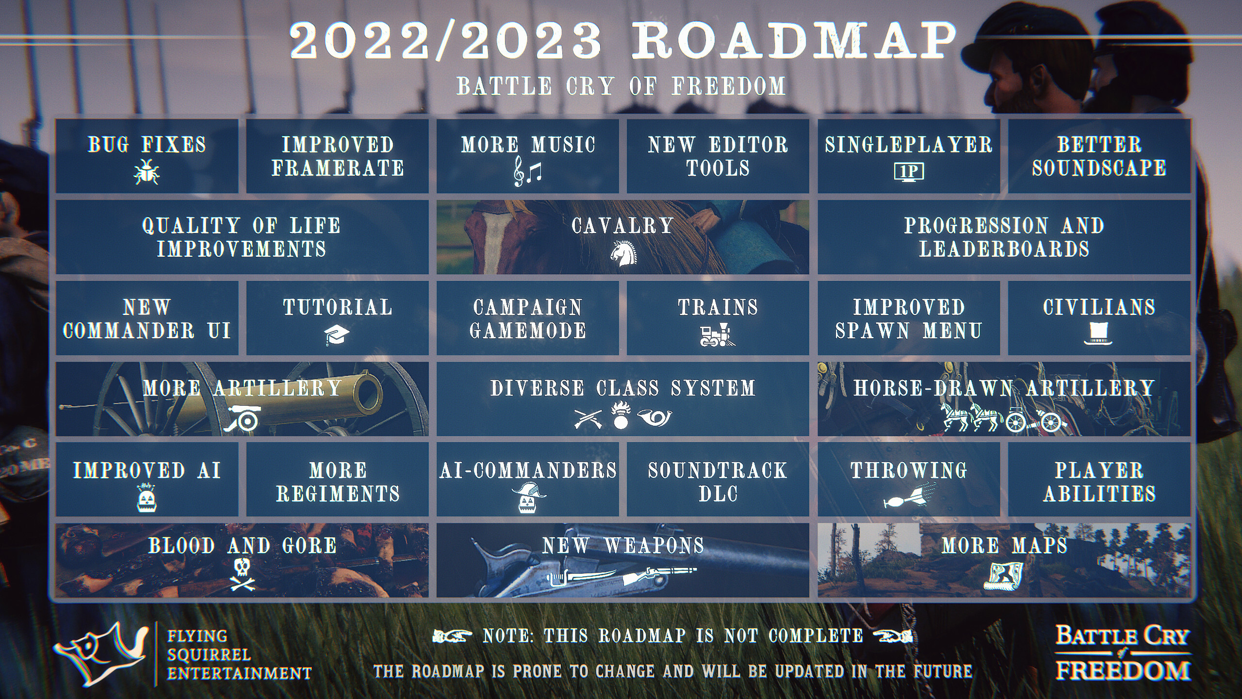 We're excited to announce that we're still hard at work on Battle Cry of Freedom and are committed to delivering all of the promised features on our roadmap for 2022/23.