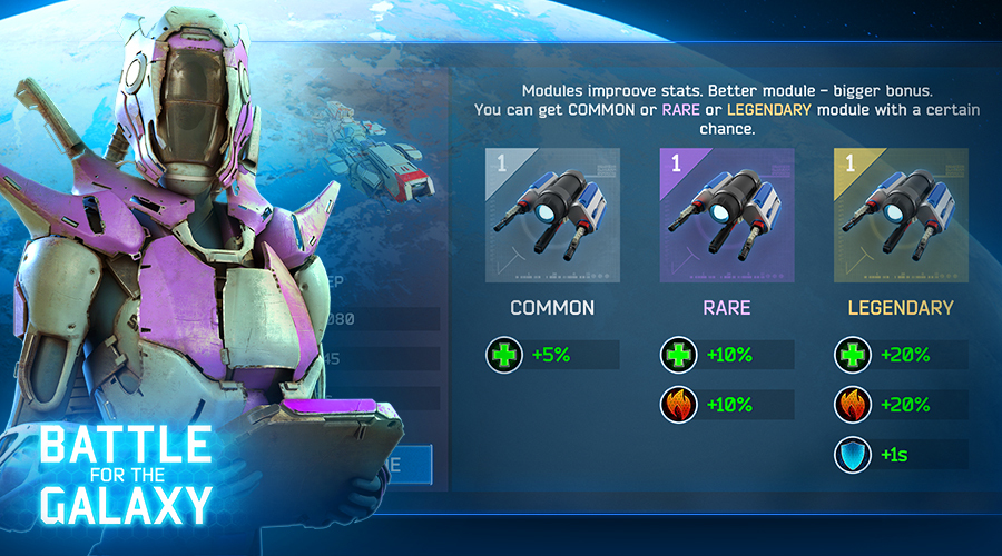 To help new players navigate through the game and have more of them stay longer in the Galaxy, we have decided to introduce a much more simplified functionality of modules and artifacts. We have discarded the Inventory tab, and as of now all operations with modules will take place in the equipment tab of a unit, tower, hero or technology. Same modules will automatically merge and become available for upgrade.