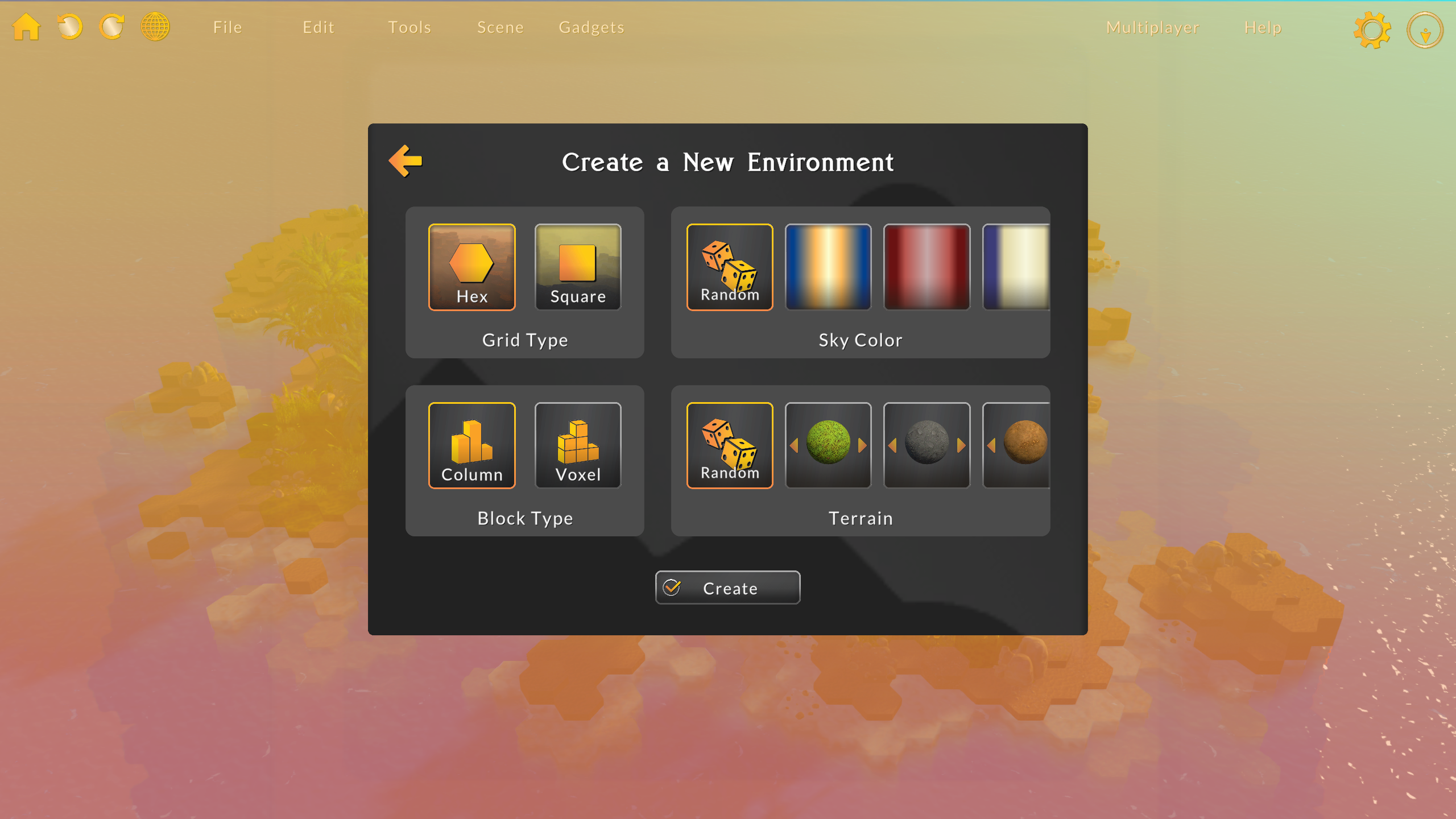 In this update I added the ability to create worlds in different locations, including land, sky, outer space, and underwater. These simple changes surprisingly add a very different feel to environments. Now, instead of selecting a sky color when creating a new world, you select a location. Each location has certain sky settings, which you can of course change later.