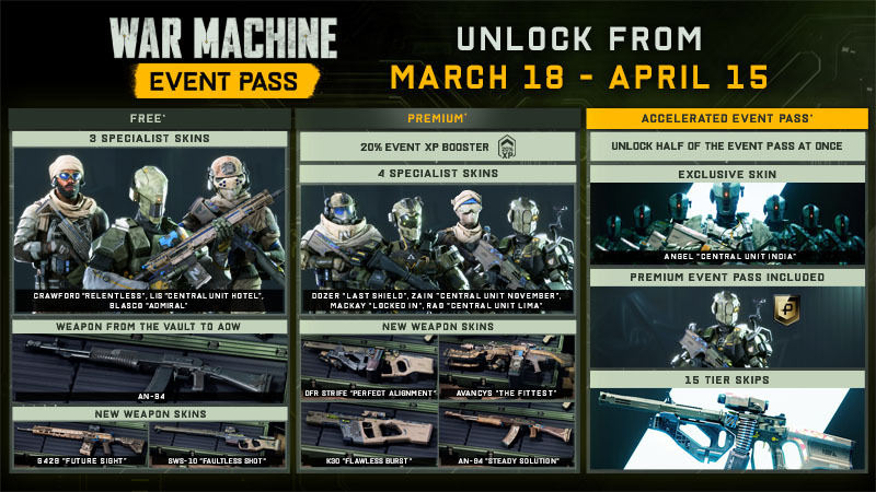 Get the War Machine Accelerated Event Pass. Available from Mar 18 - Apr 15.
