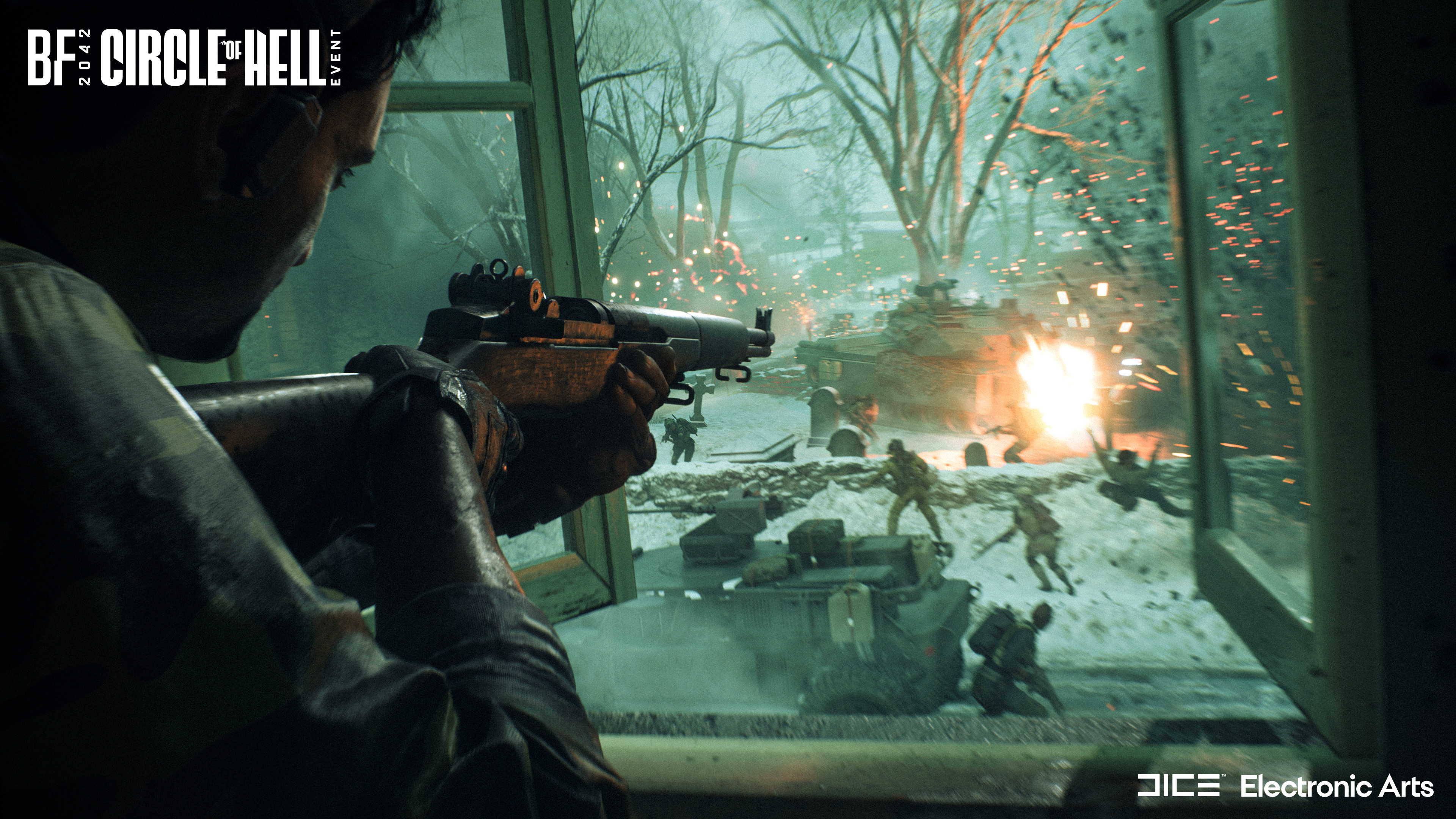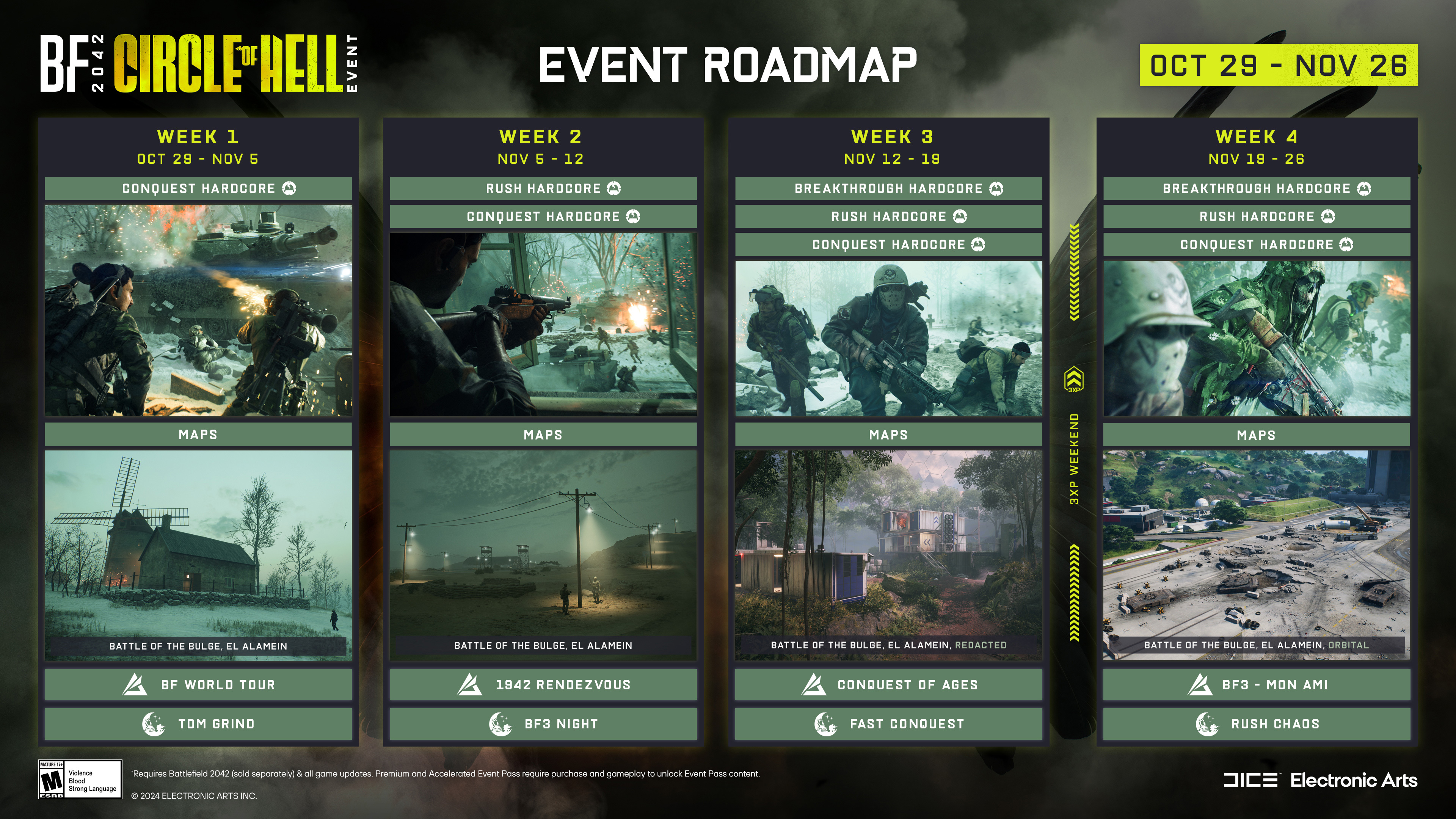 Circle of Hell* is a brand new four weeks long time-limited event coming to Battlefield™ 2042 on October 29, 2024. With it, Hardcore mode, a fan favorite of our Battlefield community, will be available for Conquest, Rush, and Breakthrough. Additionally, players can earn free and premium rewards from the spooky Circle of Hell Event Pass, including the M1 Garand which will be making its way from Battlefield Portal to All-Out Warfare.