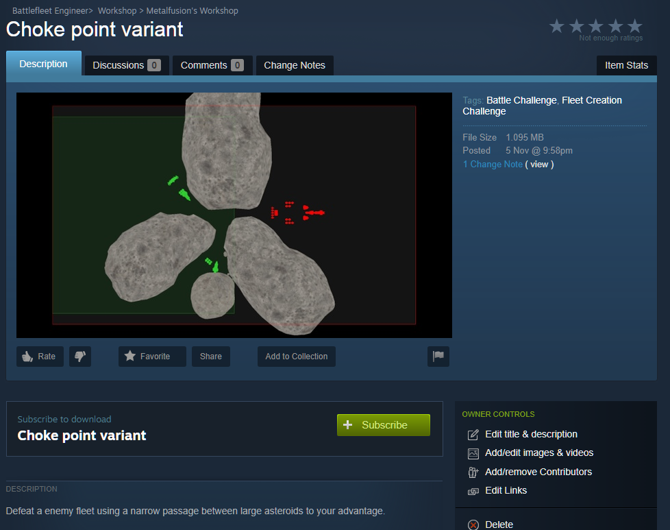 You can now publish your own battle challenges made in the Battle editor to the Steam Workshop and download ones made by others. The challenges can include your own ship designs for both the enemy and player fleet. Highscores are still only local for now at least.