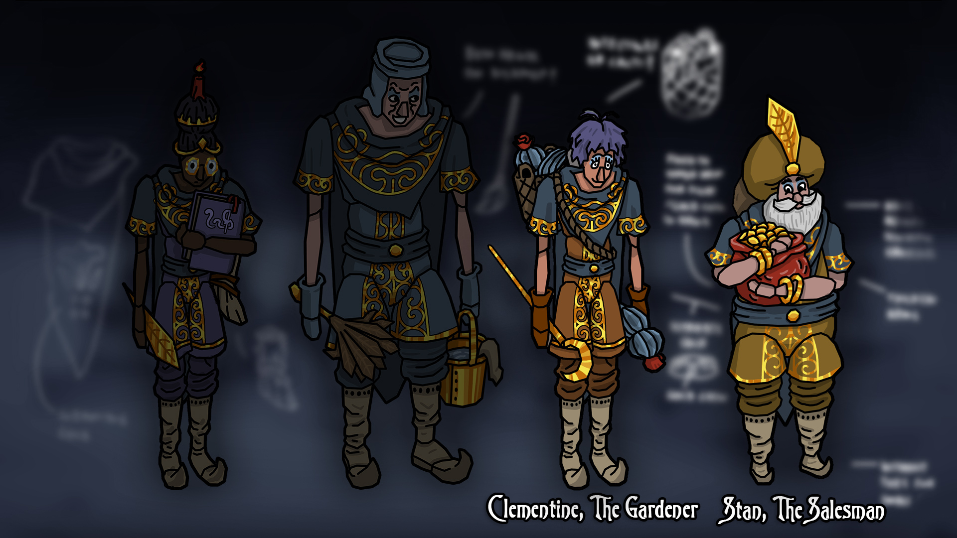 Meet Clementine, the gardener. With her eccentric purple hair and enigmatic presence, Clementine tends to the lush greenery within the desert settlement. Her dark aura and delicate touch hint at something hidden beneath the surface. Next up is Stan, the salesman. Stan, a portly figure with a generous beard and luxurious attire, almost resembles a certain sultan ;) His appearance exudes wealth and confidence as he navigates his shop.