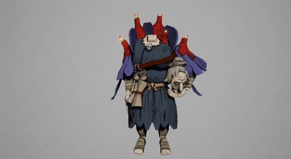 So, Dullahan is this mysterious old, headless lady who lives among her scrolls and ravens in the supernatural realm surrounding us, the Crossroads. Our artist, Patrick, had this idea to take it up a notch technically. Dullahan should have a flowing cape and candles on her back.