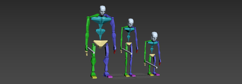 In the image above, you see three skeletons of different sizes. Upon closer inspection, you'll notice that they aren't just scaled versions of each other but have distinct proportions. Given our limited resources, creating individual animations for each character is impractical. This is where animation retargeting becomes invaluable.