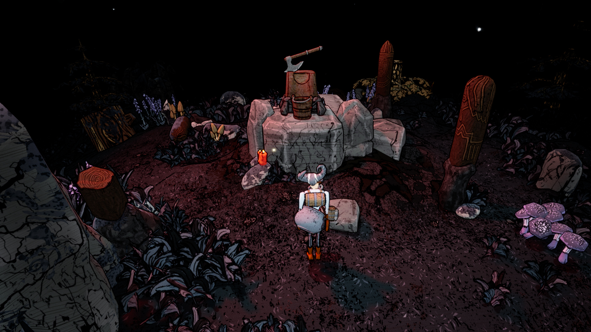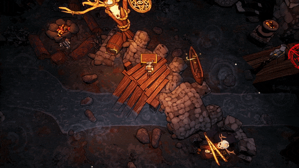 This video is an introduction to haunted places, but I'll briefly explain them again. Ritual places and possession are predominant themes in the story of BattleJuice Alchemist and now they become even more relevant mechanics-wise. In the picture above you see our very first haunted place, the Chopping Block. You solve a small riddle to activate it and then fight the possessed site itself. It is able to do a multitude of attacks like spawning minions, AOE damage, debuffs and so on.
