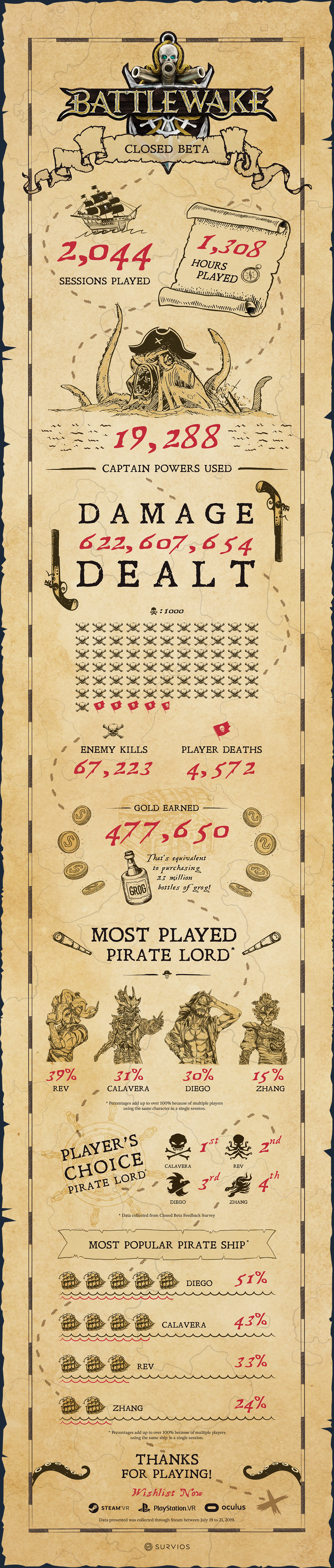 Ahoy to all our Battlewake captains! After a rip-roaringly successful Steam closed beta weekend back in July, we wanted to share the data our intrepid devs collected in the wake of your devastation, from time played to your favorite pirates and ships!