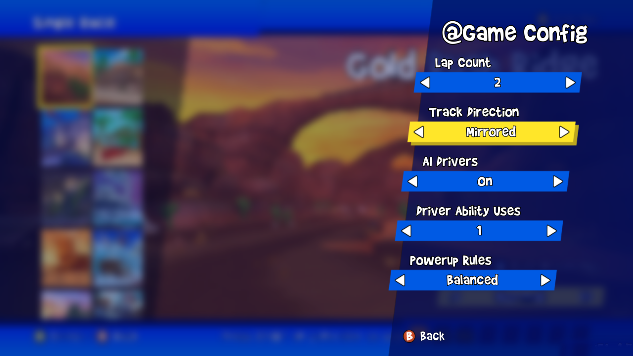 Added config options to Single Race and Championships. Right now you can set laps, AI / no AI, and how many uses you get of your character ability. Will be fleshing this out a lot in the coming weeks.