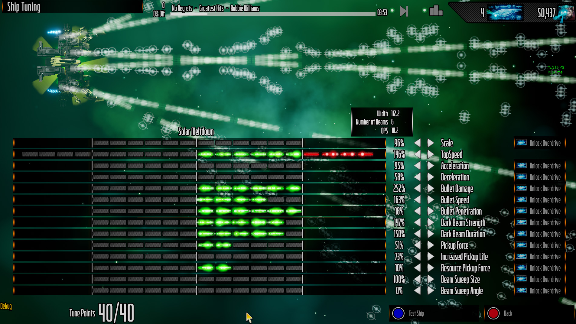 - Bullet Penetration: A % chance that any give bullet will cause damage and bounce off the enemy to go on and cause more damage. - Scale. You can now change the base size of your ship! - Dark Beam Strength & Dark Beam Duration - Resource Pickup Force: Making Scrap, Uranium & Crystals to be attracted to your ship. - Beam Sweep Size: Alter the sweep size of your beams, making it more focused, or more scattered. - Beam Sweep Angle: Alter the base angle offsets for the beams.