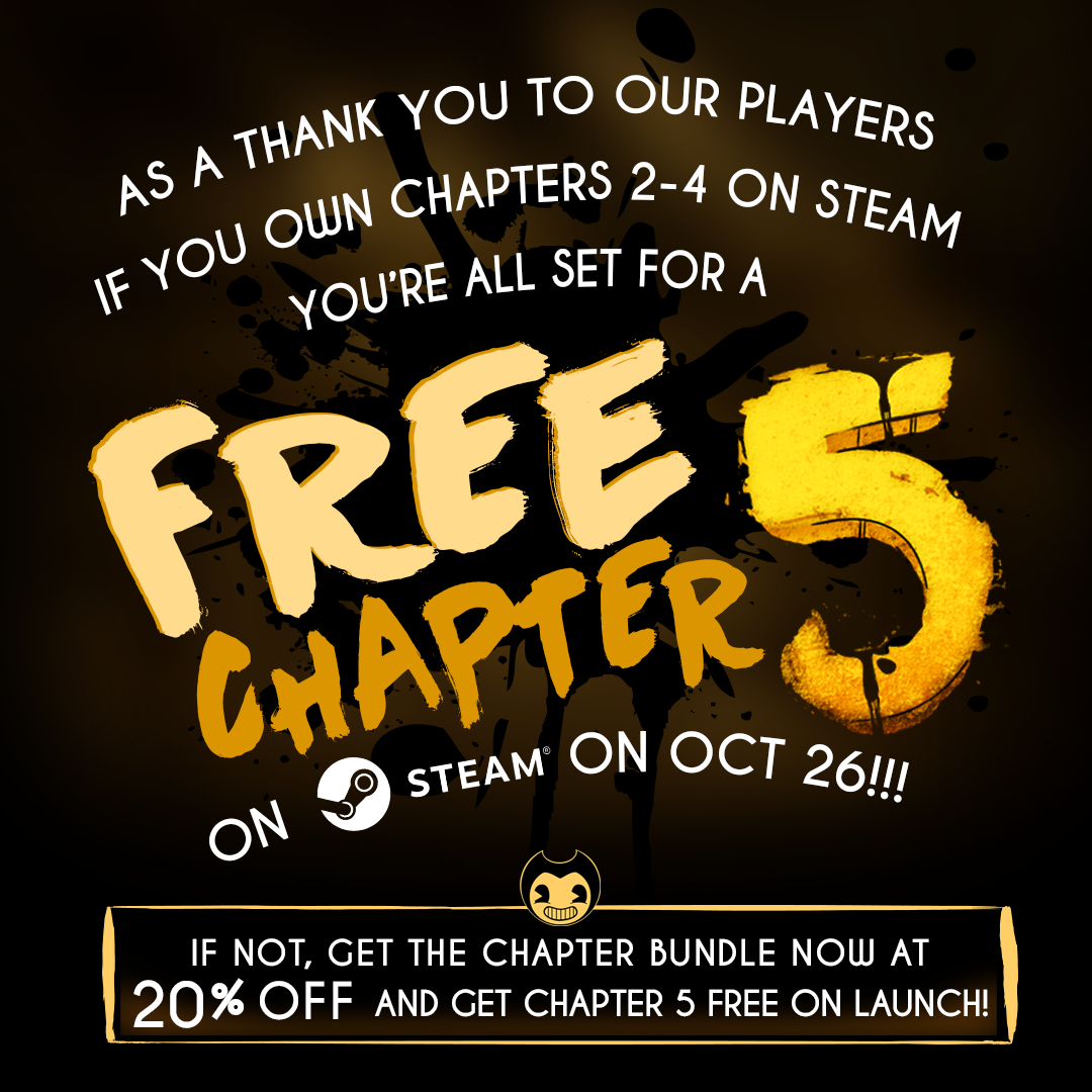 If you do not own Bendy and the Ink Machine Chapters 2-4, you can get them now through the BATIM Bundle at 20% OFF and recieve Chapter 5 completely FREE on October 26th, 2018!!