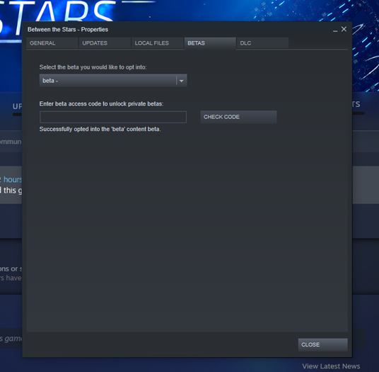 It’s easy, all you have to do is go to your Steam library, right click on Between the Stars, select Properties, and select “Beta -“ in the BETAS tab. The game will update to the latest beta version.