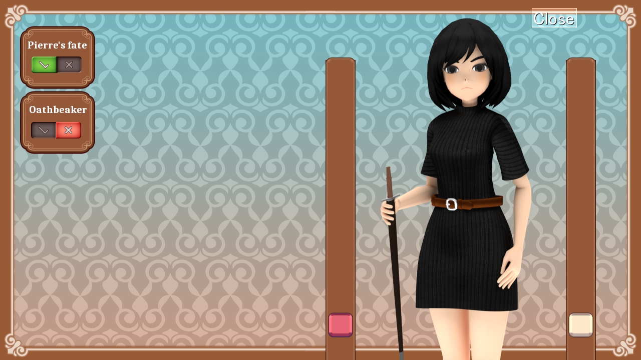1. Alignment screen has been added under menu. Now, it will mostly be empty until you are 1/4 into the game. It gets activated once you pass Pierre’s fate quest. Then your decisions on crossroads will be tracked there. You can expect this feature to be improved later. More info is on alignment.pdf on the walkthrough page.