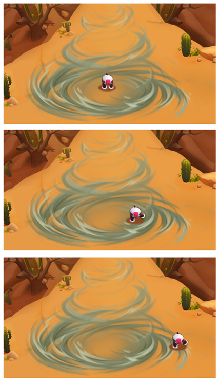 Tornadoes occasionally appear on a level, threatening to trap an adventurer inside. To get out of a tornado, move your feet while facing away from the center of the tornado, or else turbulence will launch you in a random direction.