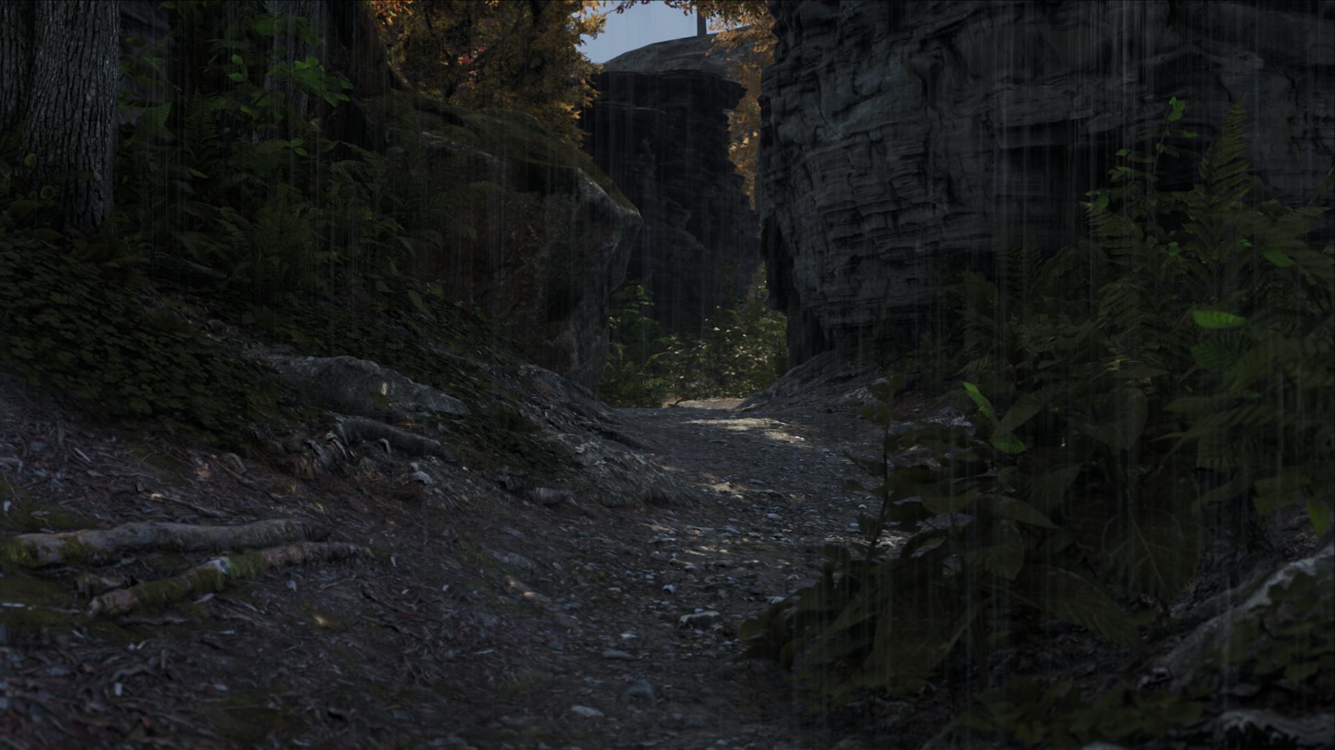 Meanwhile, rainfall has become less intense. Distant rolling thunder and lightning that suddenly brightens the sky above, paint the scene of the dark forest. However, this doesn‘t make it any more pleasant.