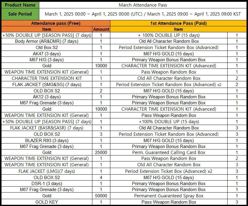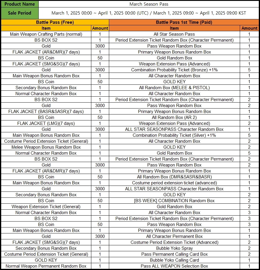 Information on March Season Pass benefits ▶ Period: March 1, 2025 09:00 ~ April 1, 2025 09:00 ▶ Premium Battle Pass final stage rewards will only change for the Season Pass. - Free Battle Pass Level 40 Reward: 1 Normal Weapon Permanent Random Box - New Premium Battle Pass Reward Level 37 Reward: Bubble Spray Paint - Premium Battle Pass Level 39 and 40 Reward: Bubble Yoko Exclusive Calling Card and Pass ALL WEAPON Selection Box
